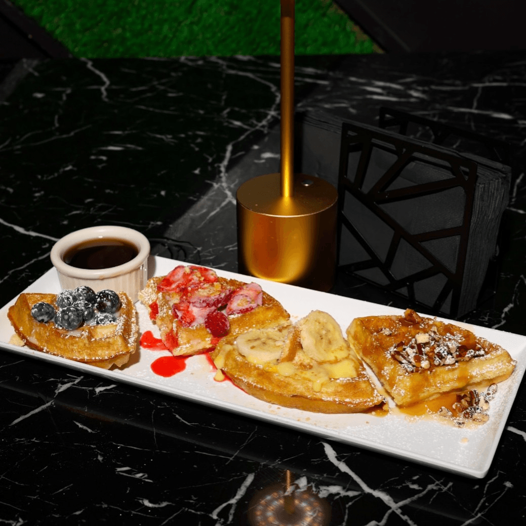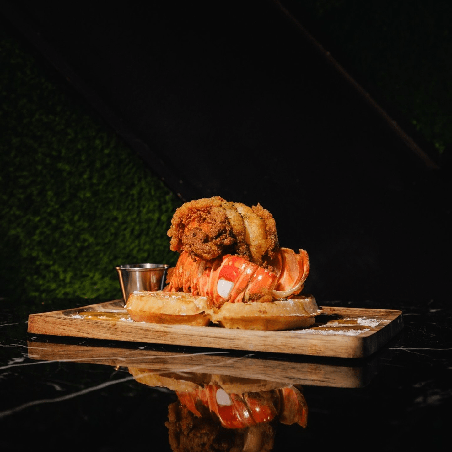 Our sweet cream waffle topped with large golden-fried lobster tail drizzled in our famous honey hot sauce