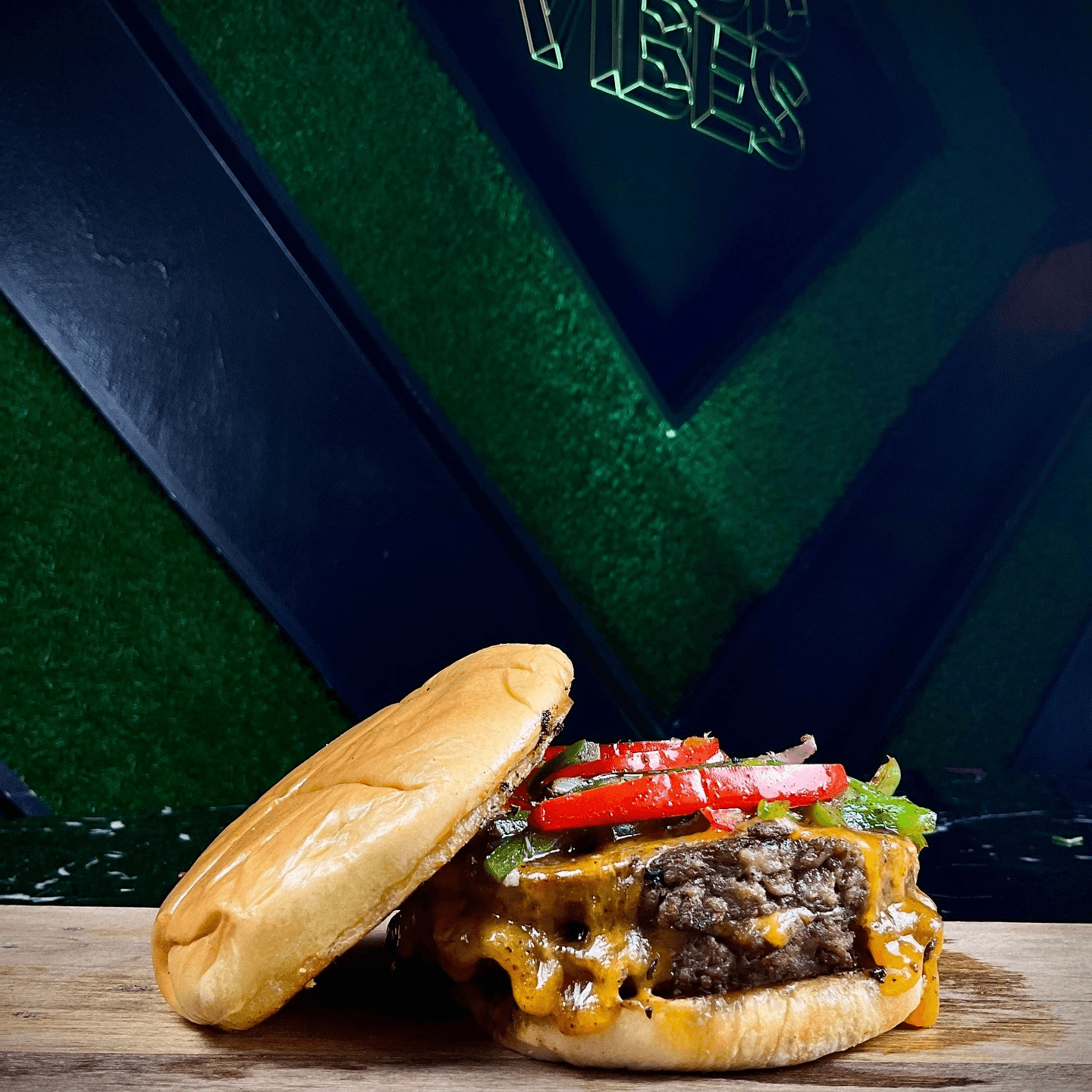 Vegan burger on a brioche bun, choose your favorite toppings: onions, lettuce, tomato, pickles, hot or mild giardiniera. Add-ons: cheddar, american, or mozzarella cheese, red and green bell peppers for additional cost