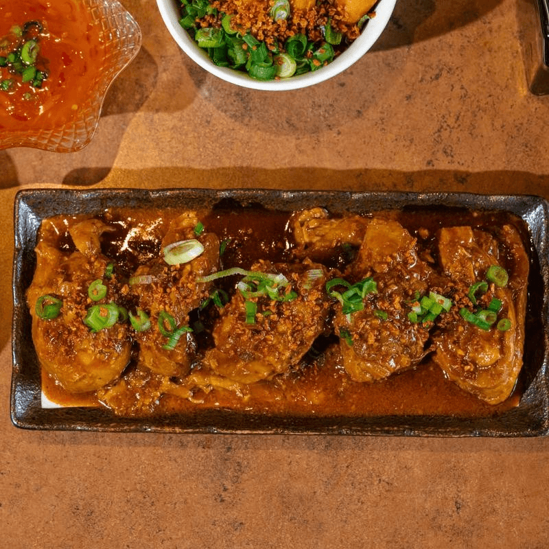 A crispy twist on the Filipino classic. Tender chicken marinated in soy sauce, cane vinegar, garlic, bay leaves, and cracked peppercorns, then fried to golden perfection and glazed with a rich, tangy adobo reduction. Crispy on the outside, juicy and flavorful on the inside — a bold balance of savory, garlicky, and slightly tangy notes.