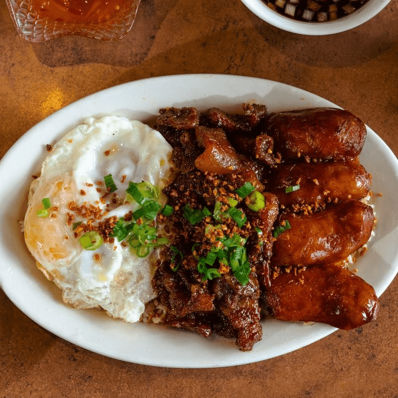 The ultimate Filipino breakfast sampler for the indecisive foodie. A flavorful trio of tocino (sweet cured pork), longganisa (Filipino sausage), and a crispy fried egg, served with garlic fried rice. It's the best of everything—sweet, savory, garlicky, and totally satisfying
