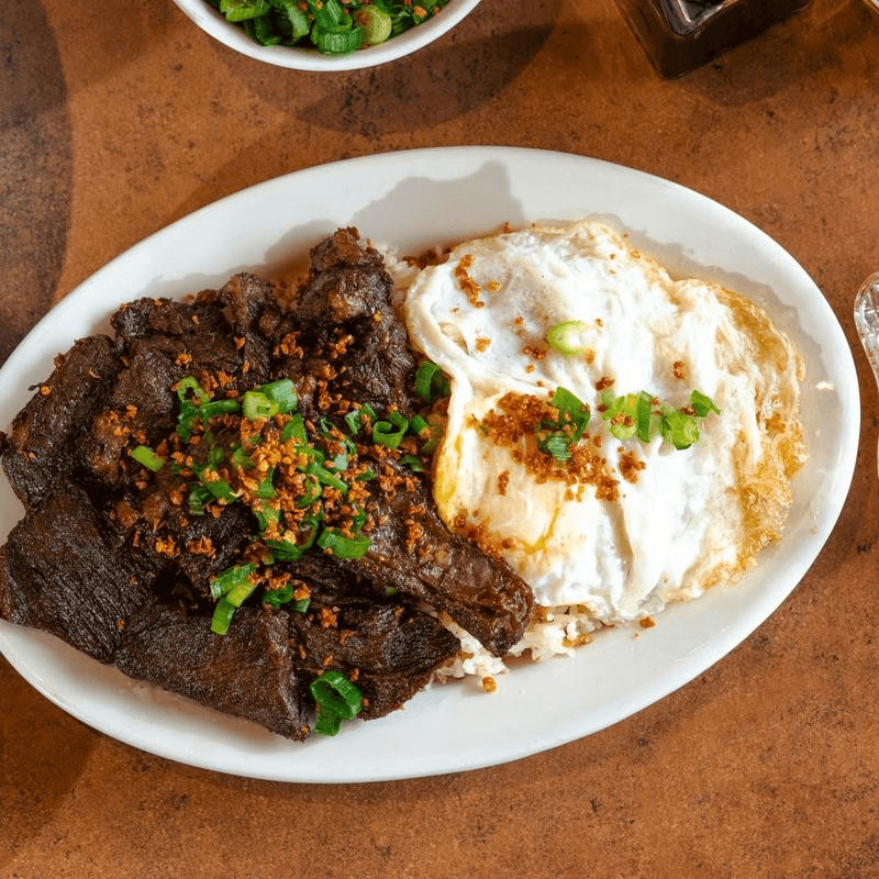The iconic Filipino breakfast that started it all. Tender, marinated beef tapa (cured beef), pan-fried to perfection, served with garlic fried rice (sinangag) and a sunny-side-up egg (itlog). Bold, savory, and satisfying