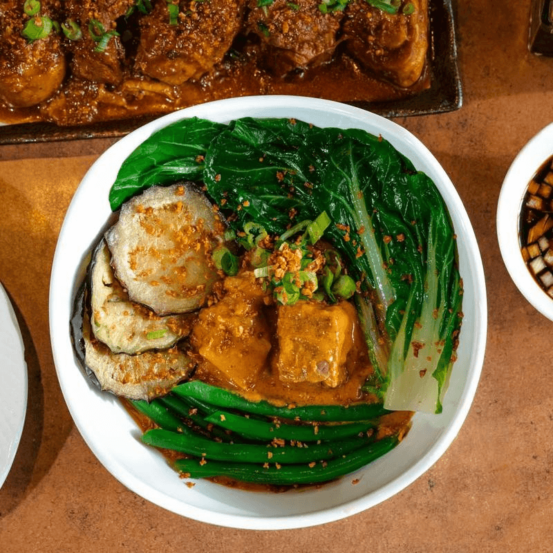 Crispy lechon drenched in our savory kare-kare (peanut) sauce with green beans, eggplant, bok choy, and onions