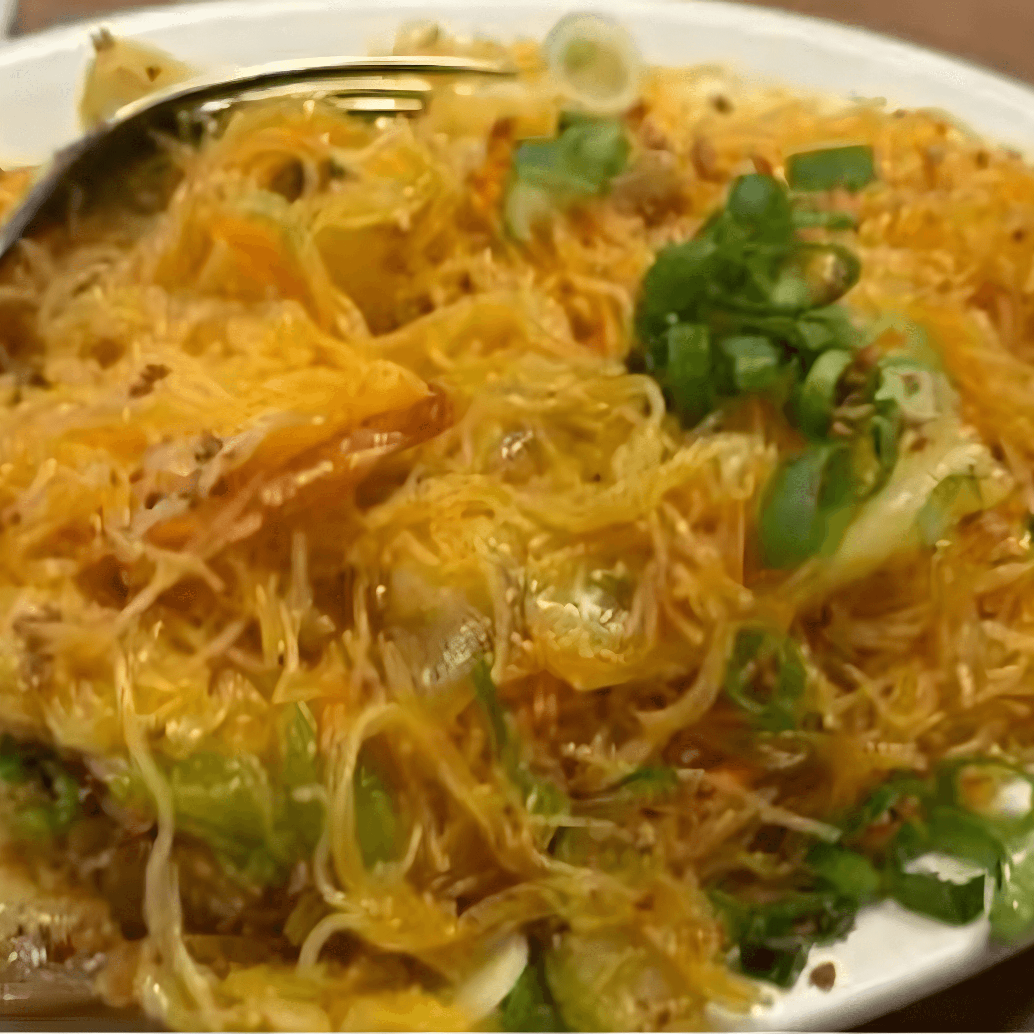 Thin rice noodles wok tossed with julienned celery, onions, carrots, cabbage and pea pods served with pork