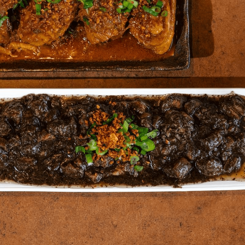 Golden, deep-fried pork belly tossed in a bold, savory shrimp paste sauce sautéed with garlic, onions, and tomatoes and eggplants on top. Served and topped with fresh scallions, this Filipino favorite delivers the perfect balance of salty, umami richness. Traditionally paired with steamed rice for a complete, comforting dish.