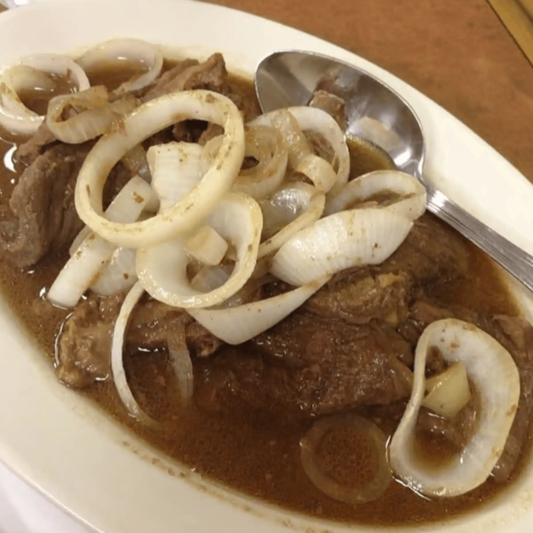 Strips of beef slowly cooked with calamansi, soy sauce and onions