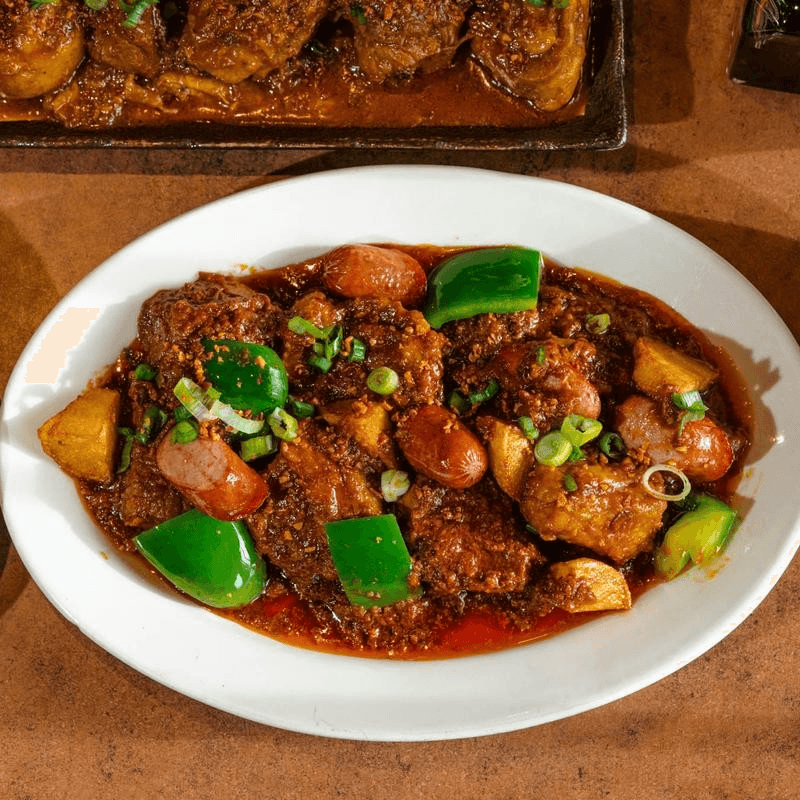 Beef with green beans, eggplant, annatto, bok choy and onions stewed in a rich peanut sauce. Served with shrimp paste on the side