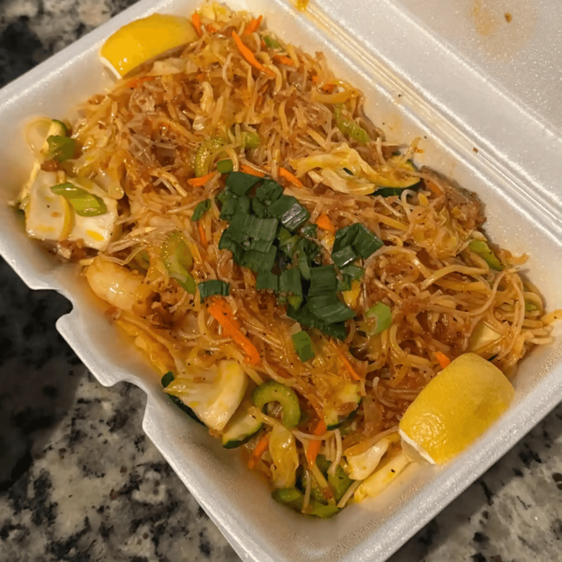 Thin rice noodles wok tossed with julienned celery, onions, carrots, cabbage and pea pods served with shrimp