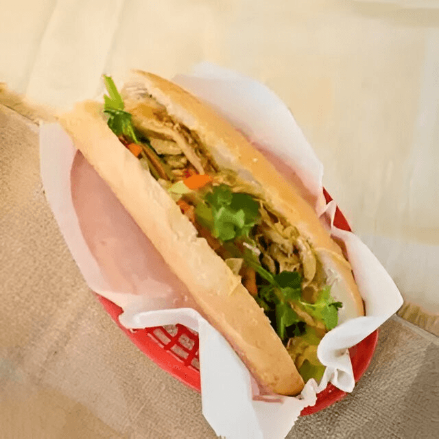 (Bánh mì gà) . Chicken sautéed with butter, onion, cucumbers, cilantro, jalapeño, and soy sauce.