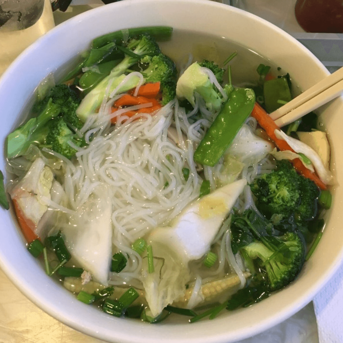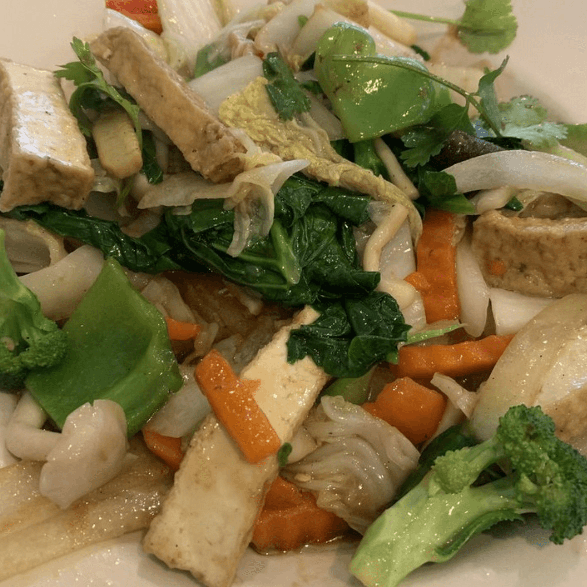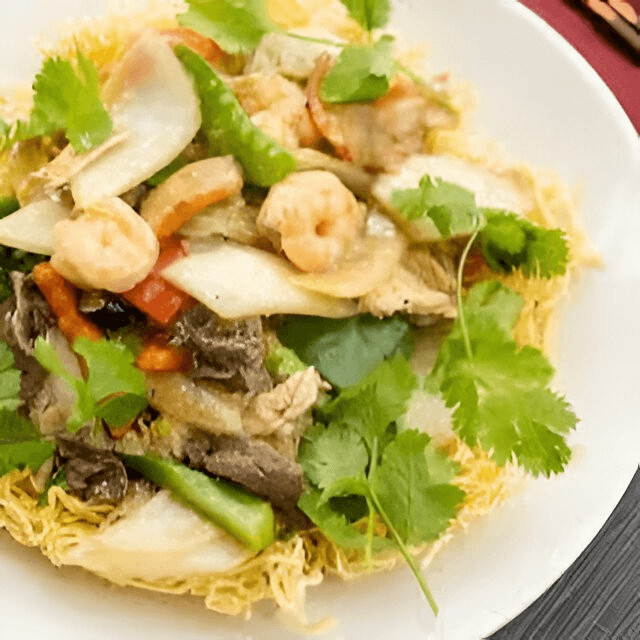 (Hủ tíu xào chay) Your choice of crispy or soft noodles.