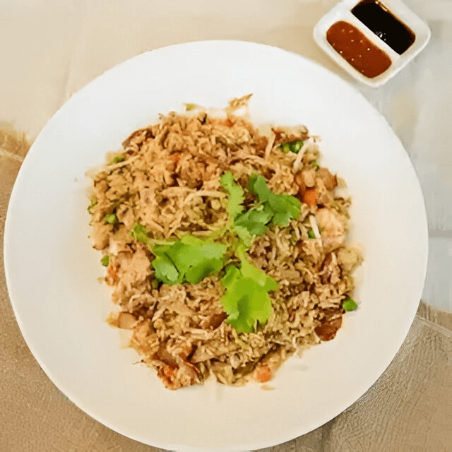 (Cơm chiên thập cẩm) Includes beef, shrimp, chicken, BBQ pork, egg, green peas, carrot, and bean sprouts.