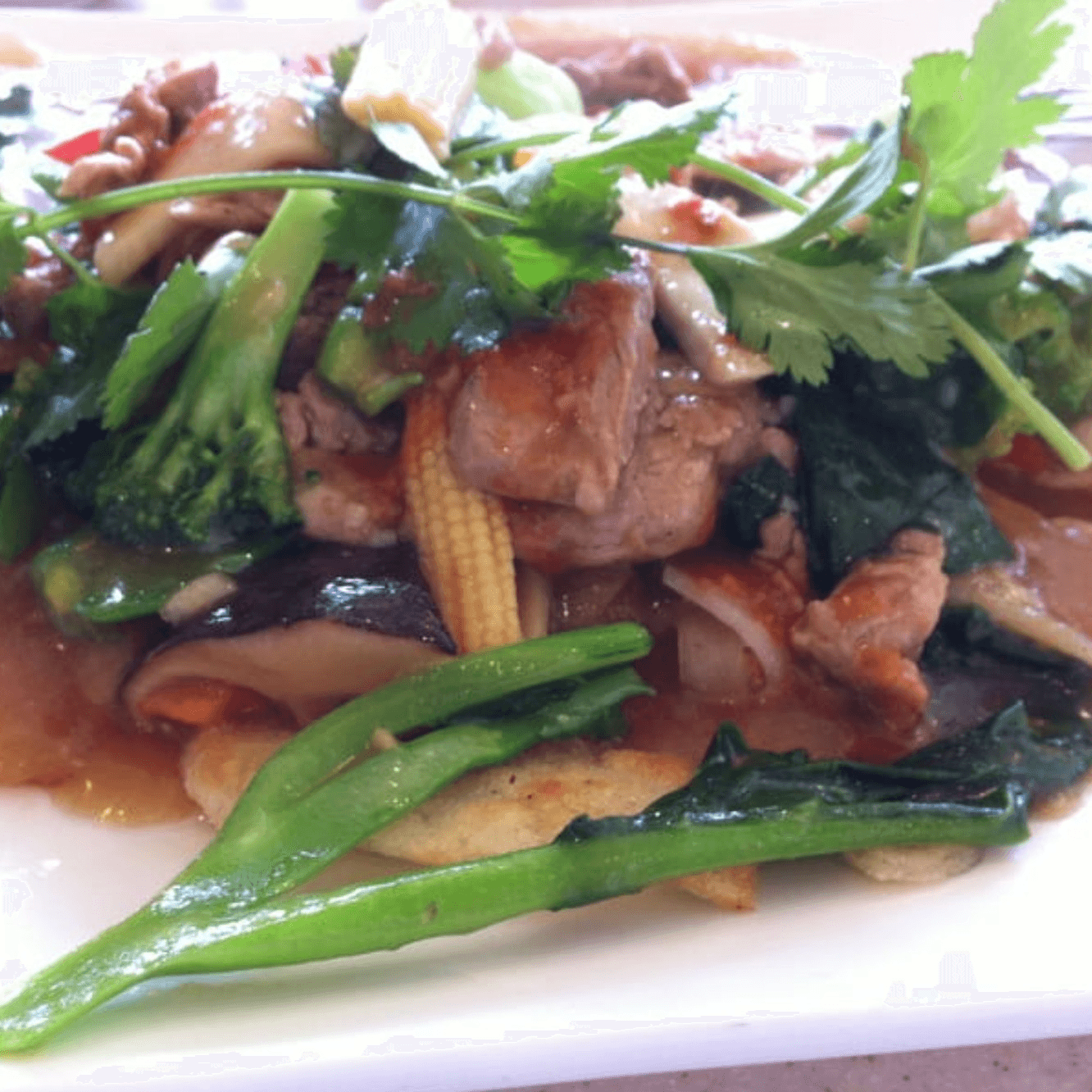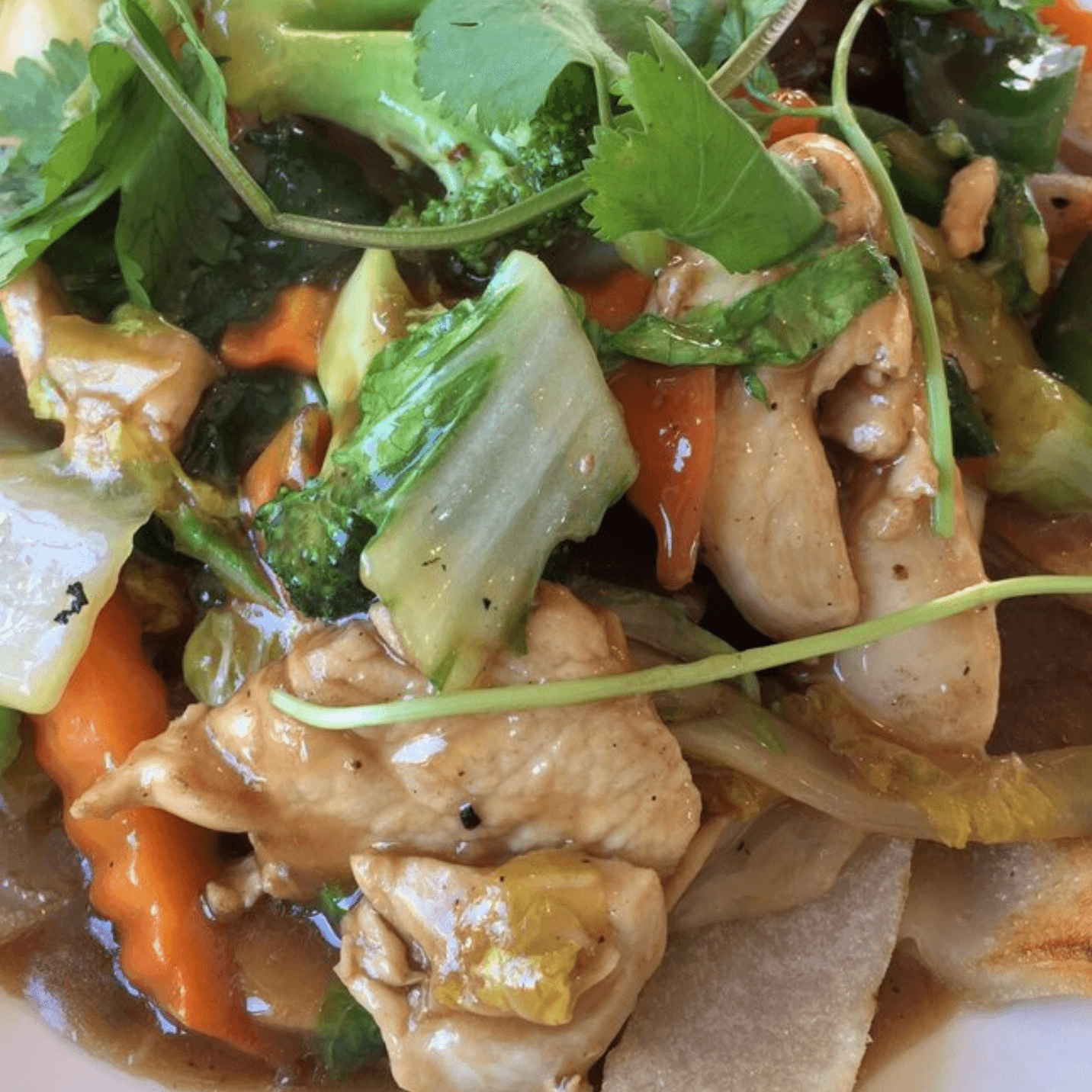 Beef stir-fried with broccoli, napa, pea pods, carrot, bean sprouts, shiitake mushroom, giant oyster mushroom, and onion. Served with steam rice.