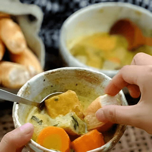 with Baguette on the Side. (Bánh mì Cà ri Gà) Chicken, curry, coconut milk, carrot, taro, onion, green onion, and cilantro.