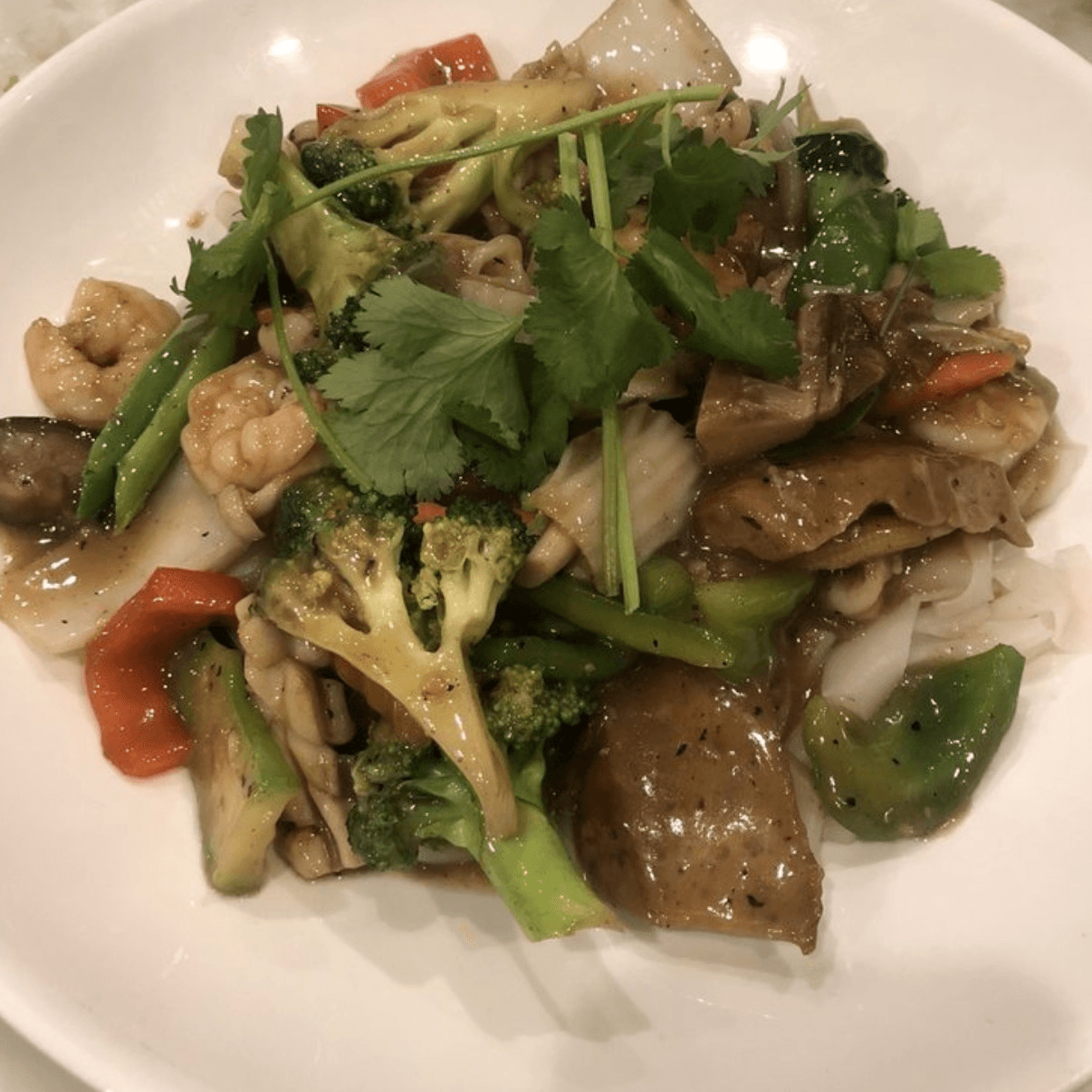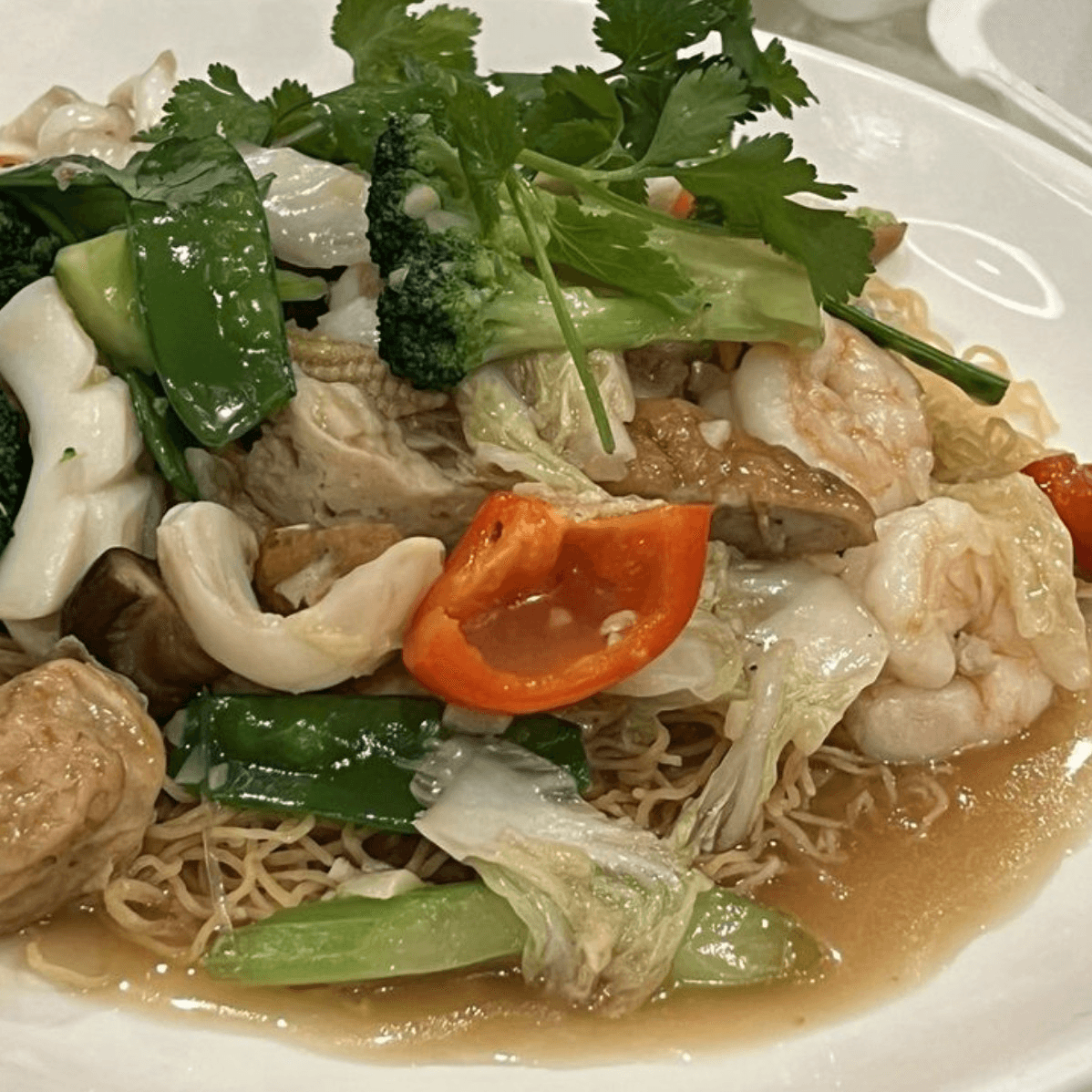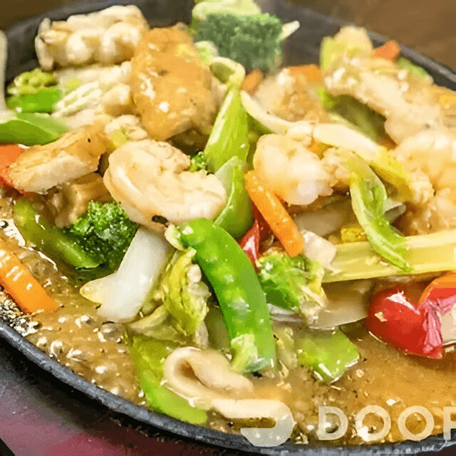 Seafood stir-fried with napa, broccoli, pea pods, green peas, carrot, shiitake mushroom, giant oyster mushroom, and bean sprouts.