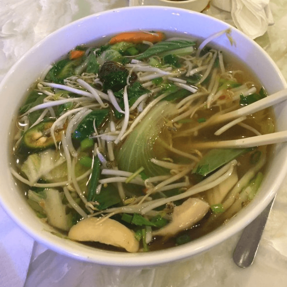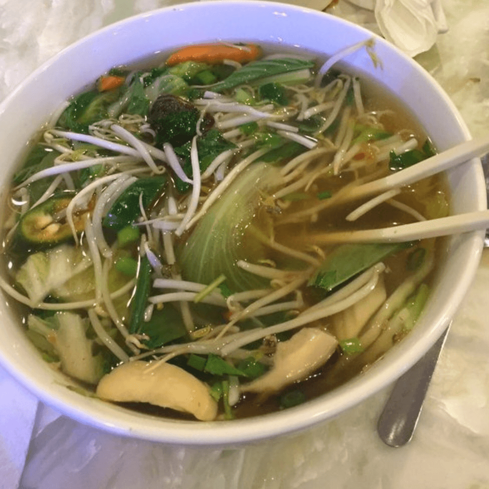 Includes lettuce, chives, carrot, celery, green onion, cilantro, garlic oil and fried onions. Served with a side of bean sprouts, basil leaves, lime, and jalapeño.