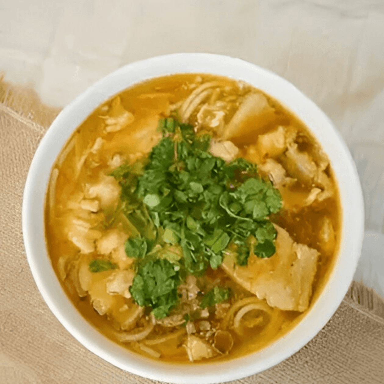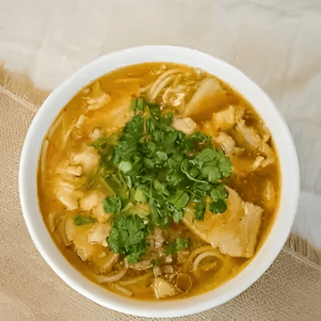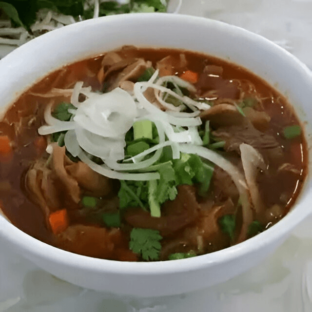 (No Substitutions). (Phở Xe Tang) Rice noodles in beef with sliced beef, well done brisket, well done flank, soft tendon, bible tripe, meat ball, scallions, onions, and cilantro.