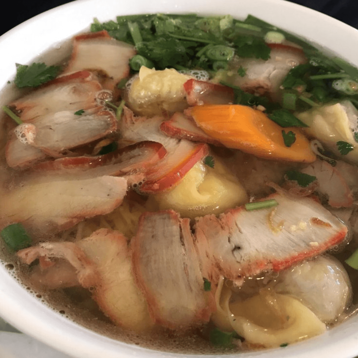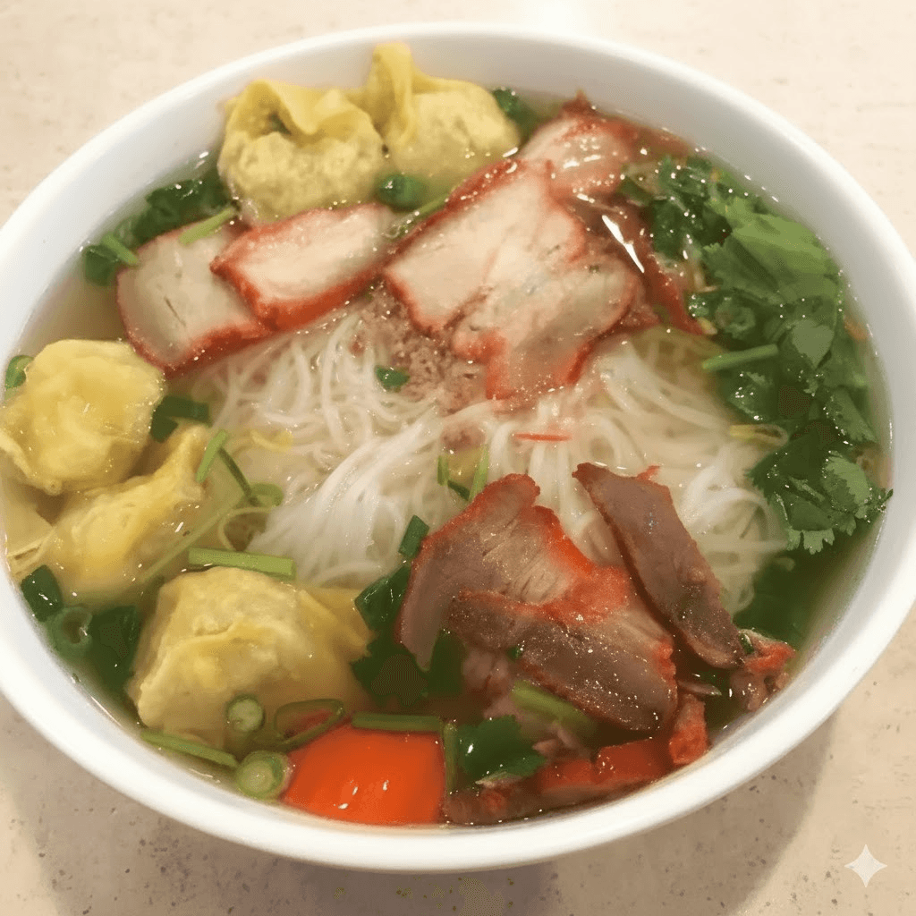 (Hủ Tiếu /Mì Hoành Thánh) Noodles, chicken broth, wonton (wrapped with ground pork, chopped shrimp, shiitake mushrooms, and wood ear mushroom), BBQ pork belly, ground pork, and fried garlic pork skin oil.