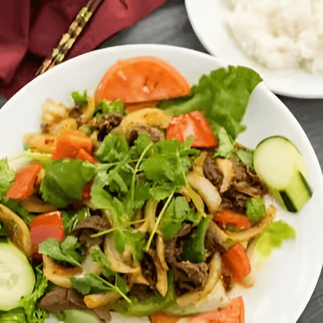 Beef stir-fried with tomato, onion, green onion, and homemade fish sauce. Served with steam rice.