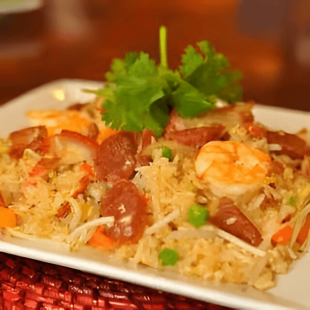 (Cơm chiên dương châu) Includes large shrimp, BBQ pork, Chinese sausage, egg, green peas, carrot, and bean sprouts.
