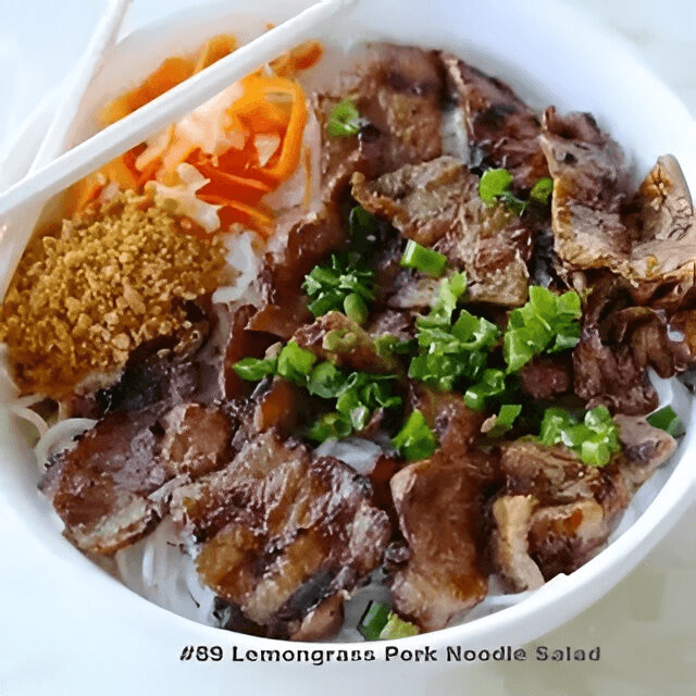 (Bún bò nướng, tôm, chả giò, nem nướng) Lemongrass steak, shrimp, grilled pork patty, and pork egg roll.