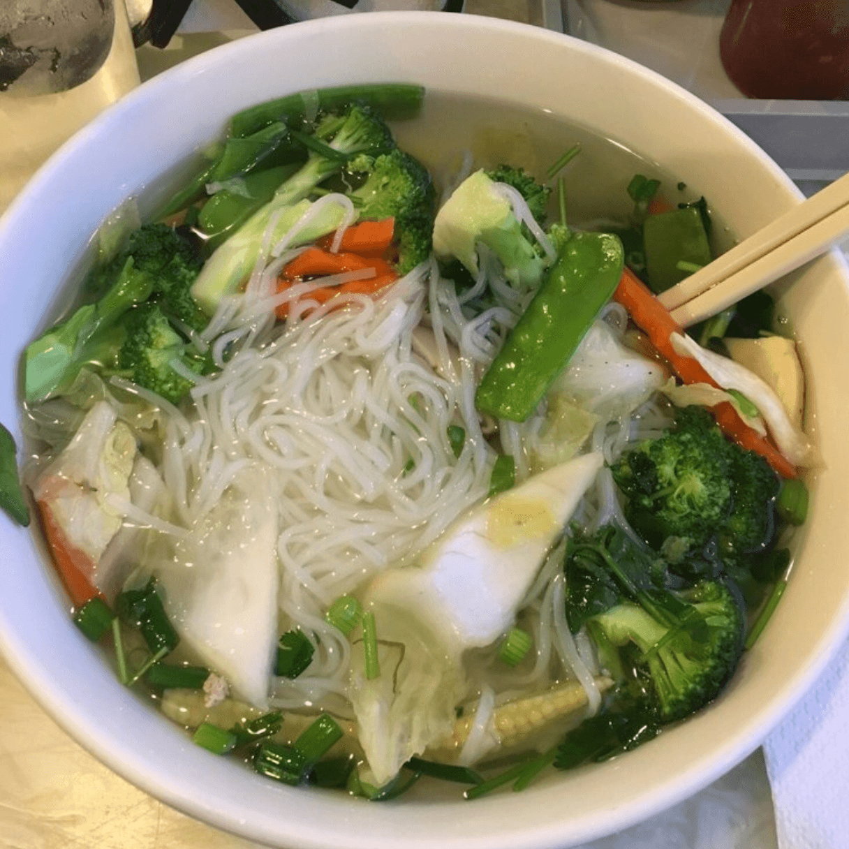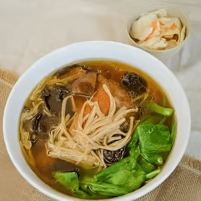 Noodle, chicken broth, broccoli, Chinese broccoli, napa, shiitake mushrooms, shemiji mushroom, carrot, pea pod, celery, baby corn, green onion, and cilantro.