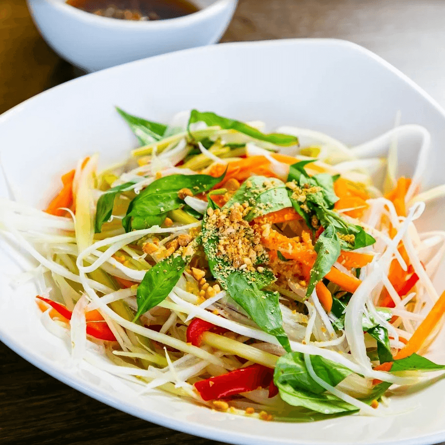 (Gỏi đu đủ chay) Red and green bell pepper, celery, carrot, basil, onion, cilantro, Vietnamese coriander, peanuts, and lime.