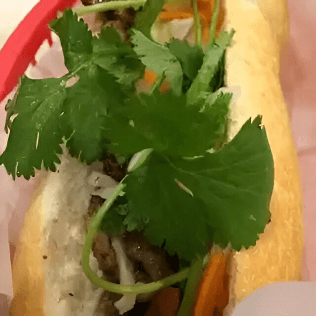 (Bánh mì heo nướng). Marinated lemongrass pork with cucumbers, cilantro, jalapeños, pickled carrots & radishes, and green onion.