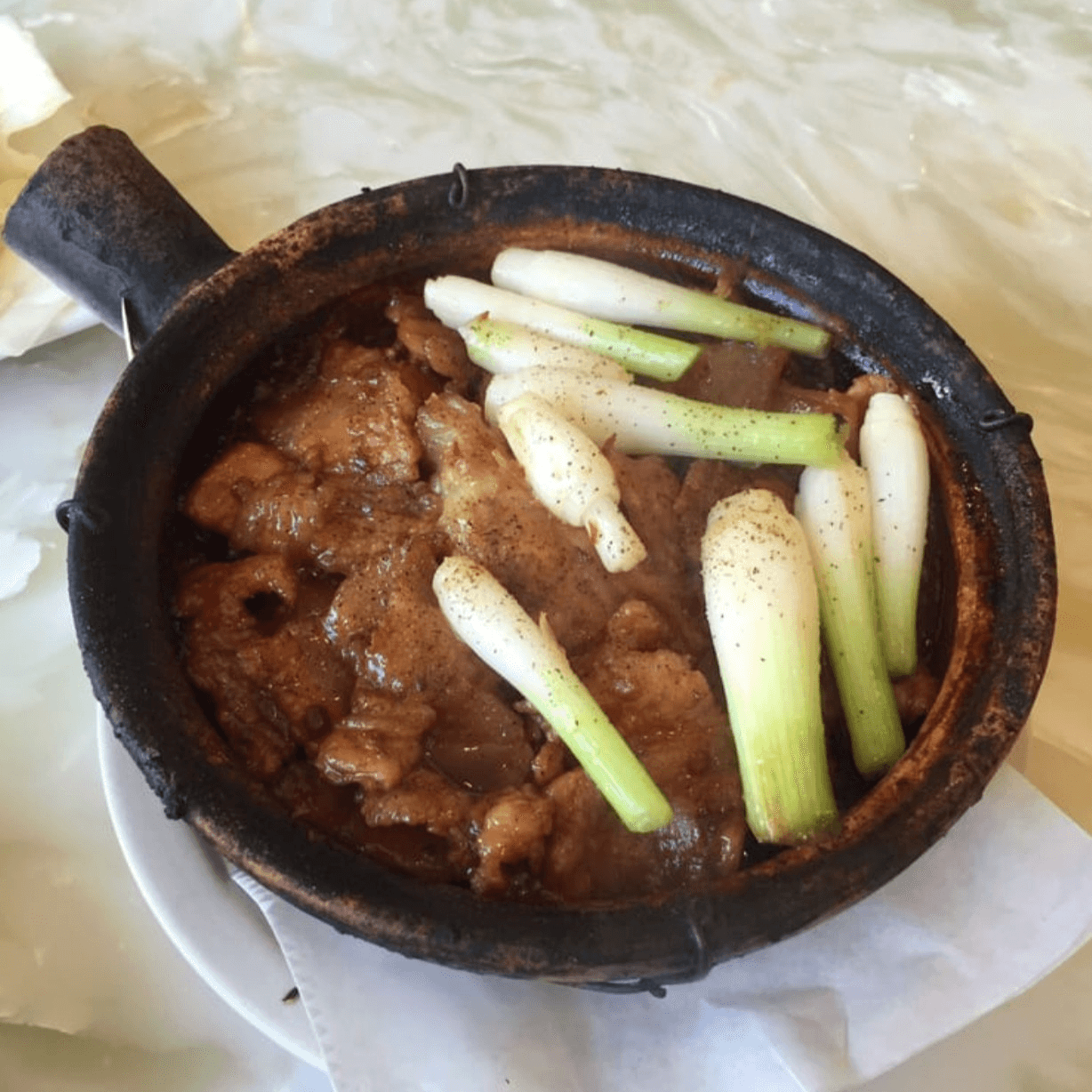 (Thịt heo ram mặn) House special sauce, green onions, and black pepper with a side of pickled veggies.
