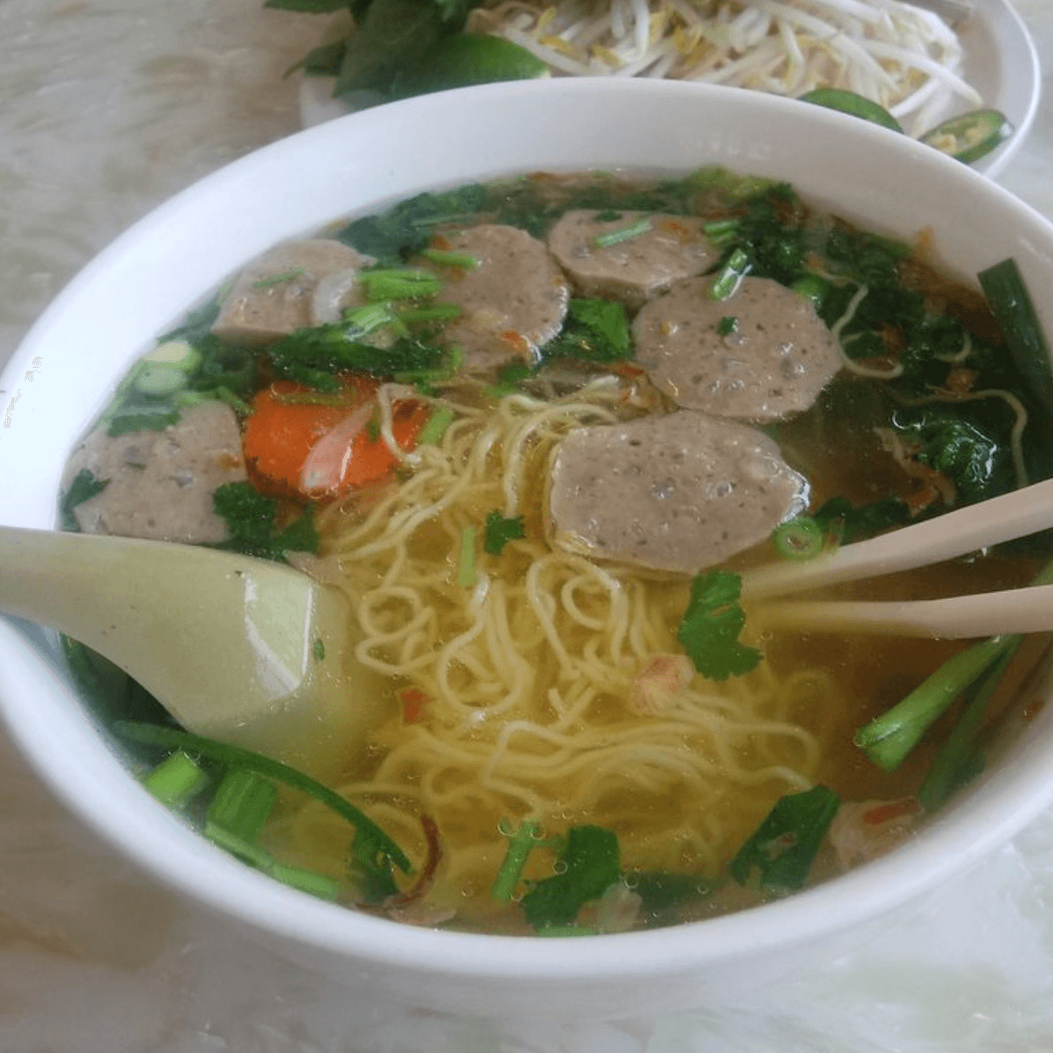 (Hủ Tiếu /Mì/ bò viên) Noodles, chicken broth, beef meatballs, ground pork, and fried garlic pork skin oil.