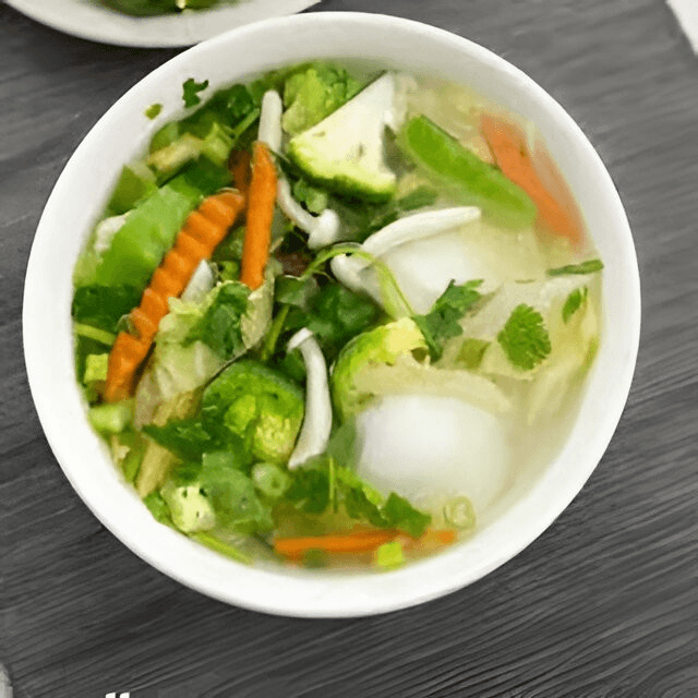 (Canh Đậu hủ Rau cải) Soft tofu, baby corn, broccoli, pea pod, carrot, shiitake mushroom, giant oyster mushroom, celery, cilantro, and green onions.