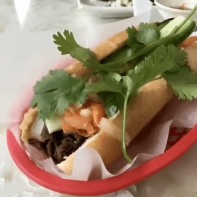 (Bánh mì thịt nguội) . B.B.Q. pork belly, pork cake, pâté, cucumber, cilantro, jalapeno, pickled radishes & carrots, radishes, and soy sauce.