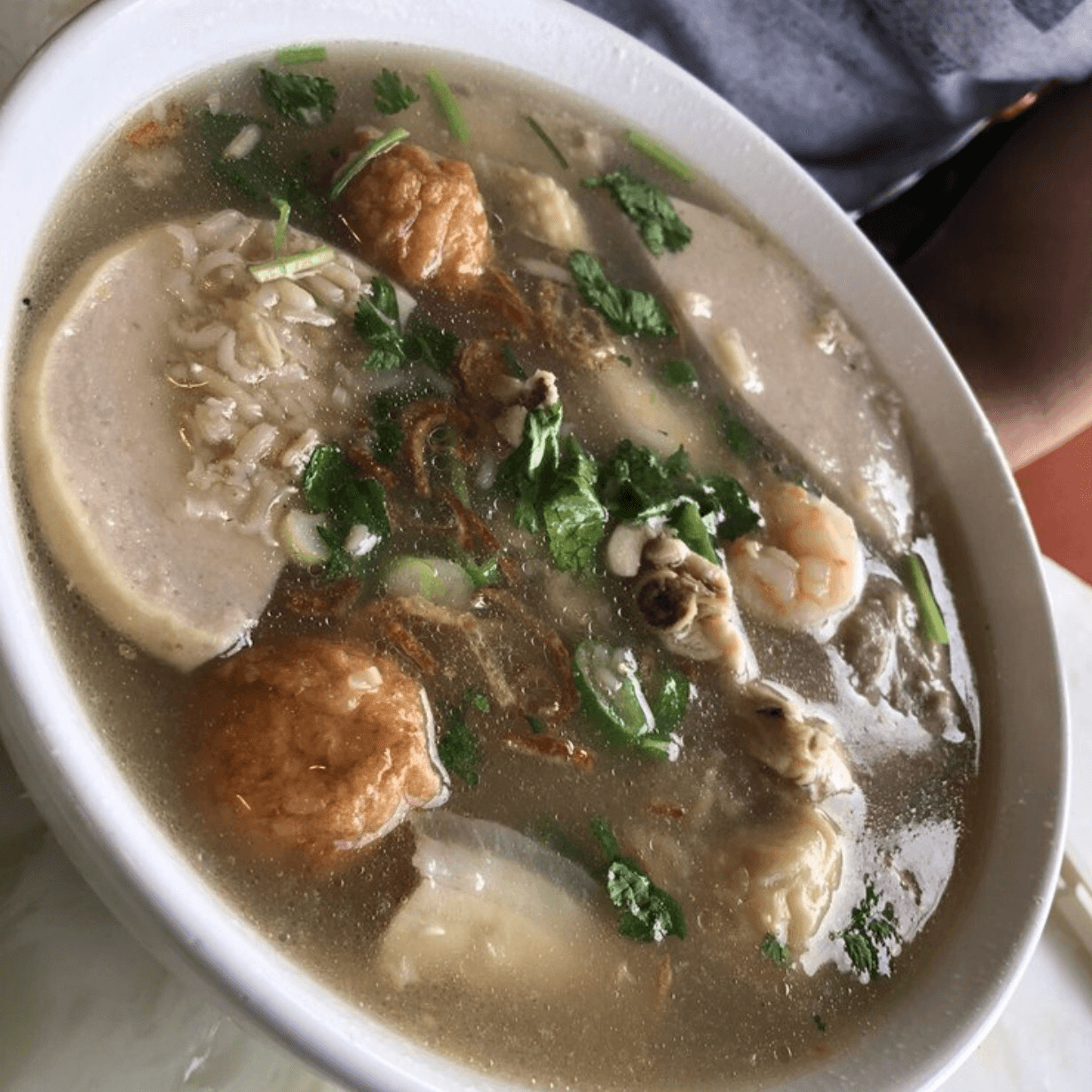 (Hủ Tiếu /Mì/ Bánh Canh đồ biển) Noodle, chicken broth, shrimp, squid, fish cake, ground pork, and fried garlic pork skin oil.