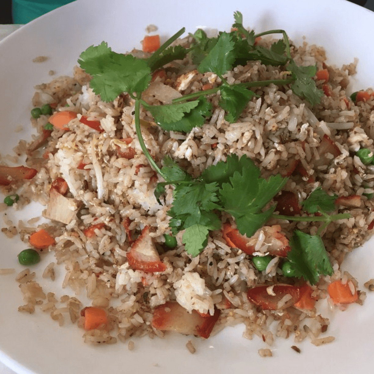 (Cơm chiên gà) Includes egg, green peas, carrot, and bean sprouts.