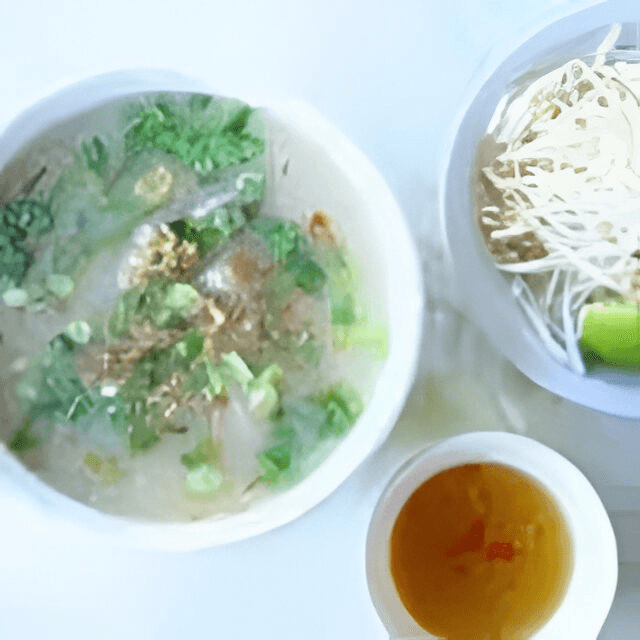 (Hủ Tiếu /Mì tôm) Noodles, chicken broth, shrimp, ground pork, and fried garlic pork skin oil.
