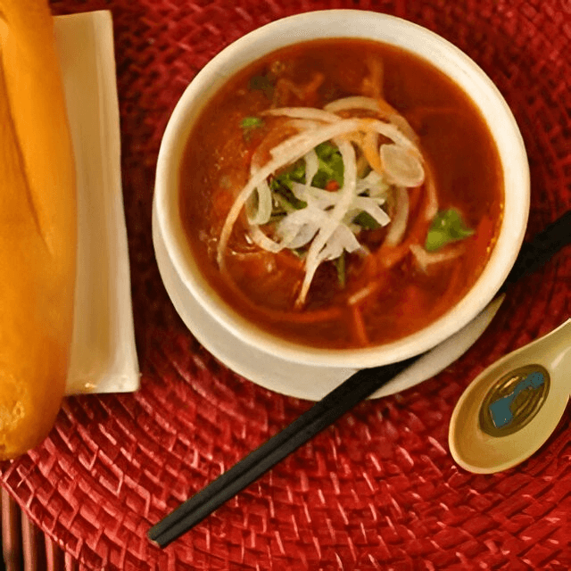 Vietnamese native, a hot & spicy favorite! Anchovy noodle soup with shrimp, catfish, pork, lemongrass, hot pepper, onion, cilantro, garlic pork oil, and pepper.
