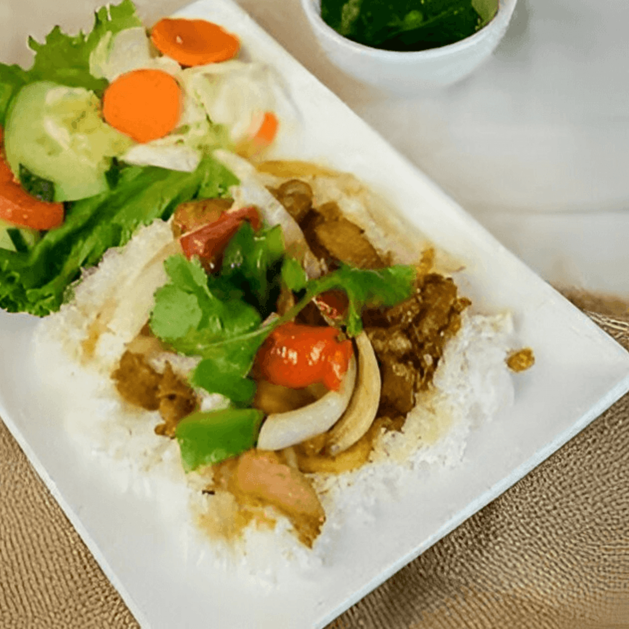 Includes hot peppers, bell pepper, onion, and fish sauce. Served with steamed rice and layered with lettuce, cucumber, and tomato.