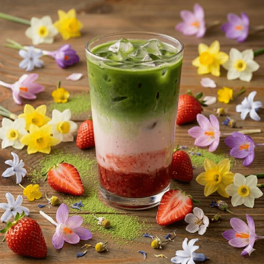 Matcha green tea powder & steamed milk & strawberry, a warm, creamy sip of sweet, vibrant comfort