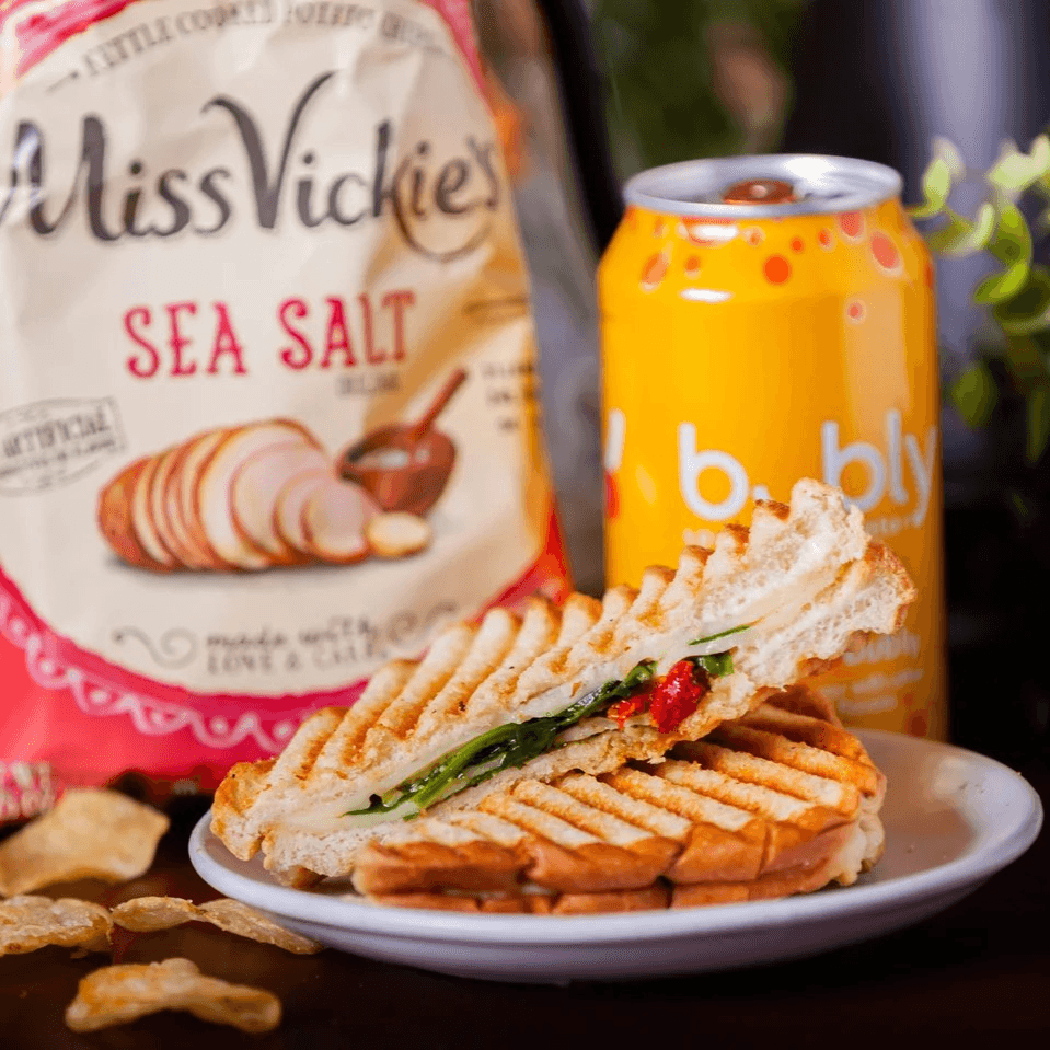 Indulge in our spinach, sundried dried tomatoes and mozzarella, all served panini style. With a side of chips