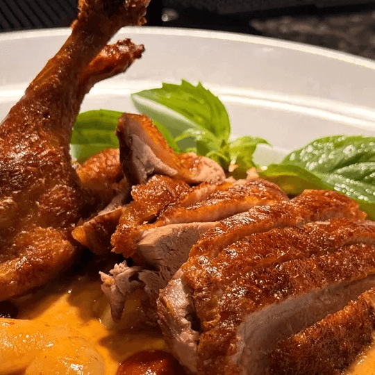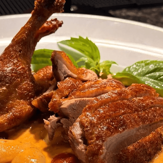 Duck breast slowly roasted, juicy and golden brown, topped with our house special lychee, pineapple, and red curry sauce