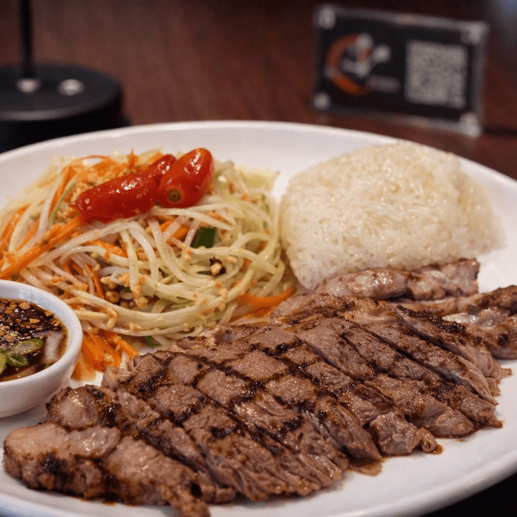 Grilled seasoned New York strip, served with Thai homemade spicy sauce on the side. Complimented with sticky rice and papaya salad