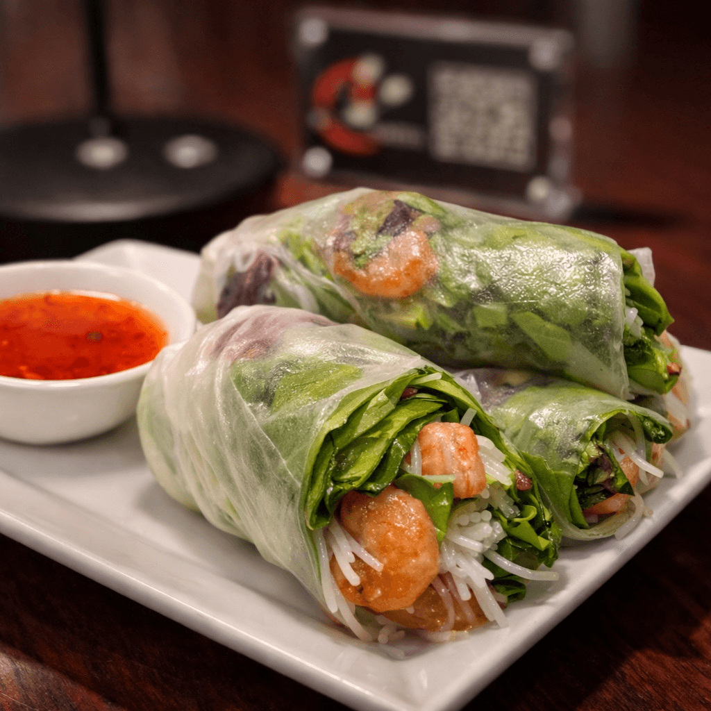 Fresh Thai soft spring rolls filled with fresh spring mix, soft noodles, sautéed shrimp, served with sweet chili sauce