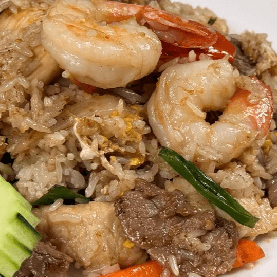 A combination of chicken, beef, and shrimp, stir-fried with rice, tomatoes, onions, and egg in our homemade sauce