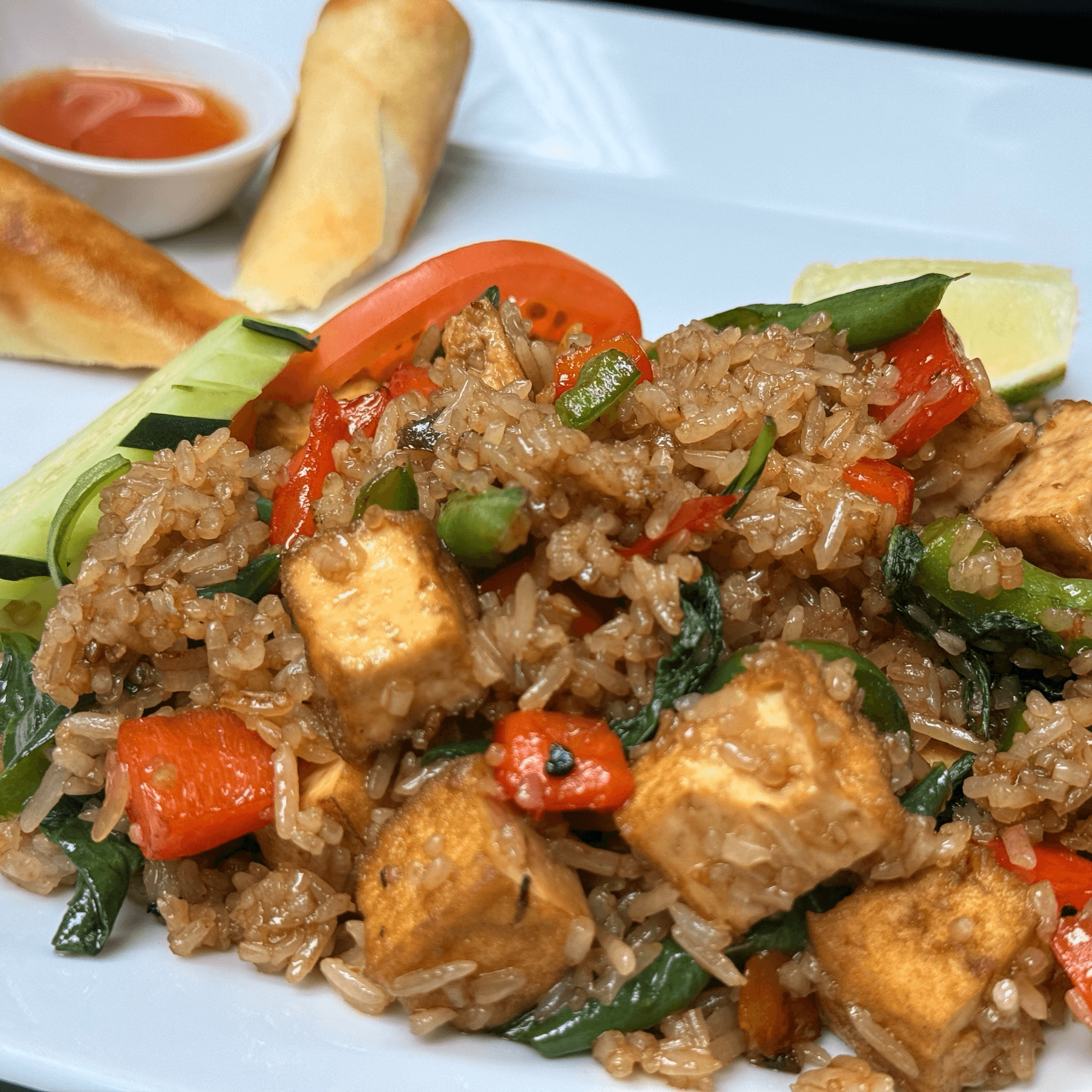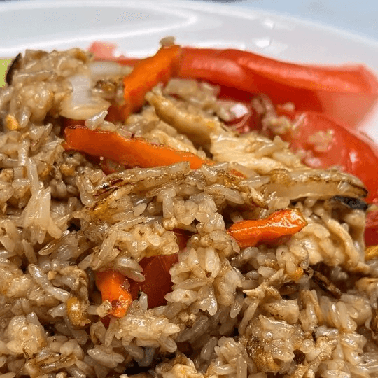 Stir-fried rice with tomatoes, onions, carrots, and egg in our homemade sauce