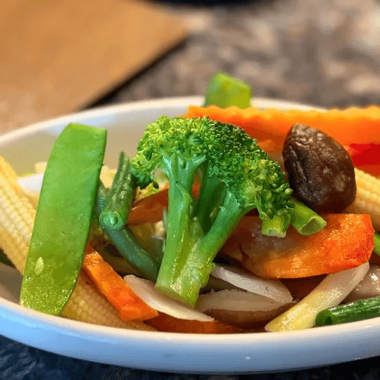 Stir-fried assorted fresh pea-pods, tomatoes, bean sprouts, onions, water chestnuts, carrots, broccoli, and shiitake mushrooms in oyster sauce