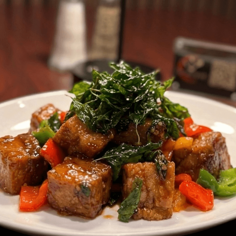 Thai street dish savory and spicy stir-fried combining crispy pork belly, basil, chili, dice bell pepper, and garlic. Served with jasmine rice
