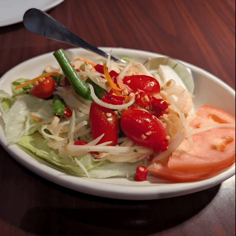 Contains nuts. Fresh green papaya, ground peanut, green bean, carrot, tomato with house dressing