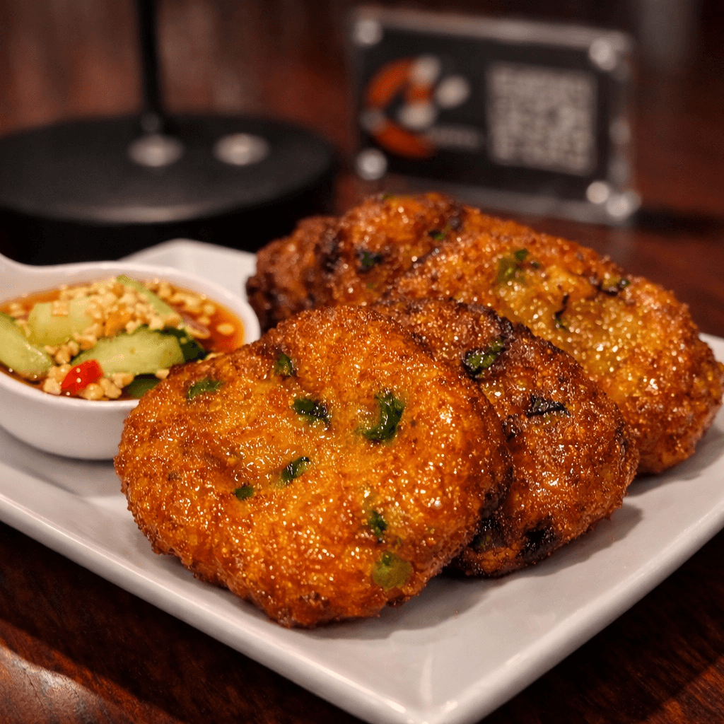 Homemade Thai-style soft-fried minced fish cake in red curry paste, served with peanut cucumber sauce