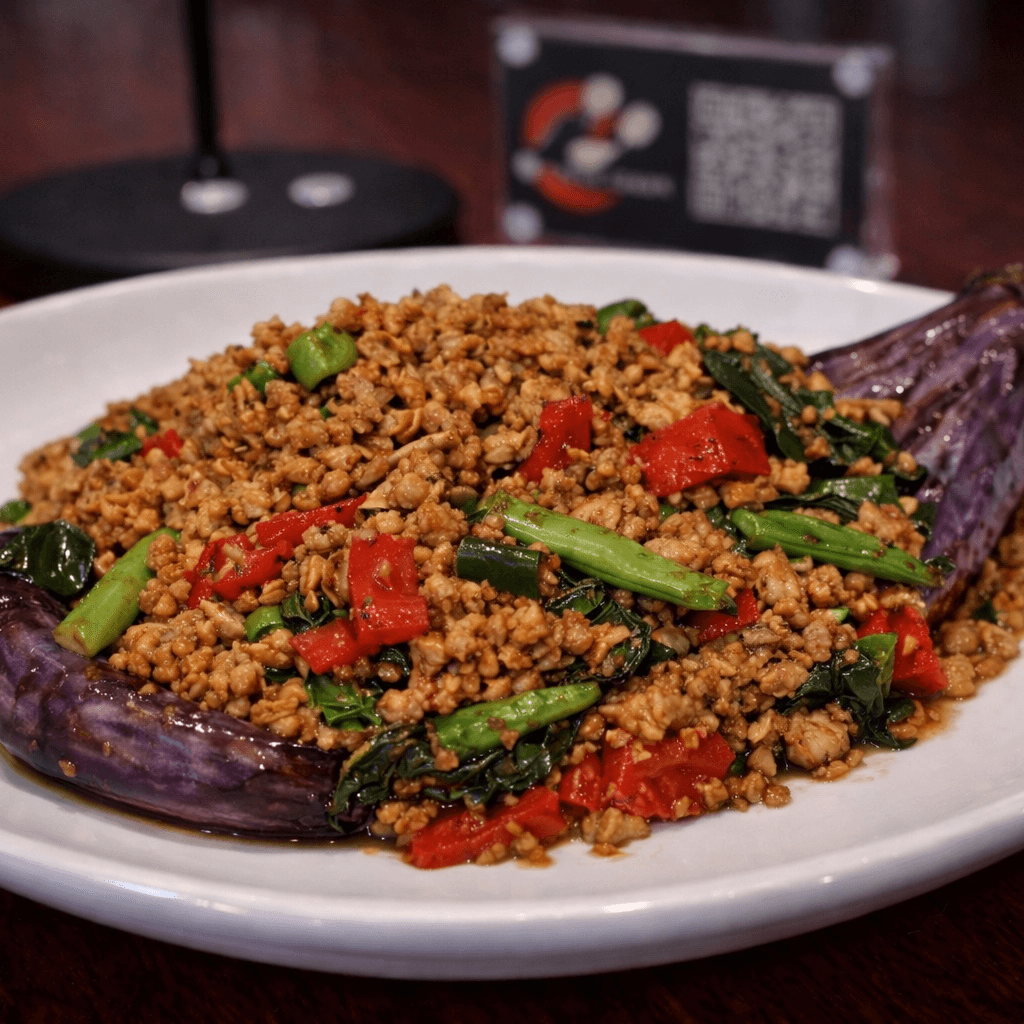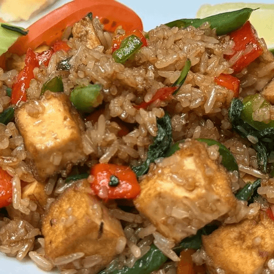 Sweet basil leaves, hot peppers, green beans, and stir-fried with rice in our homemade sauce