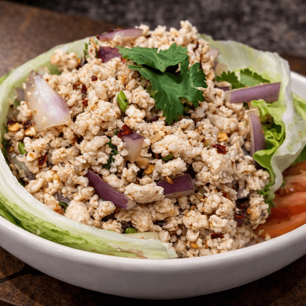 Minced chicken mixed with Thai spices, roasted rice powder, spicy lime juice, and scallions. Served on fresh lettuce
