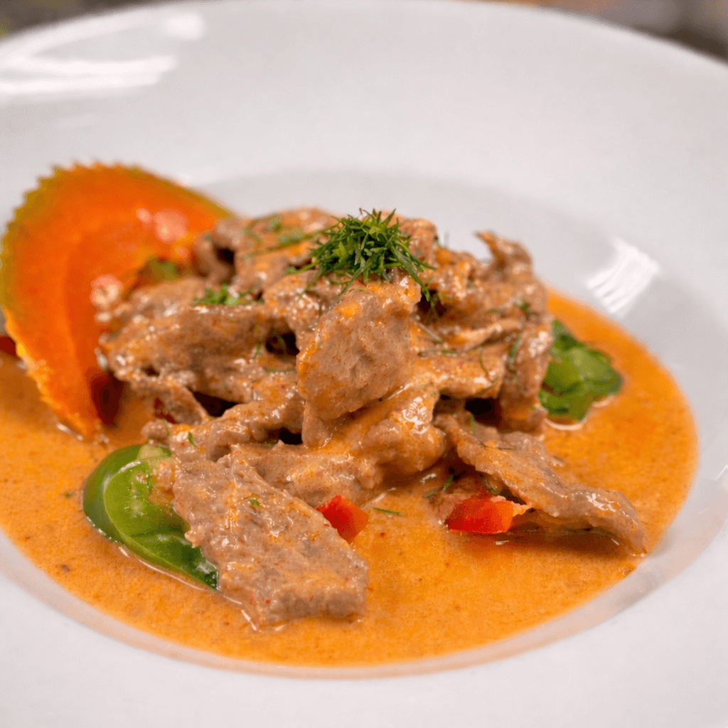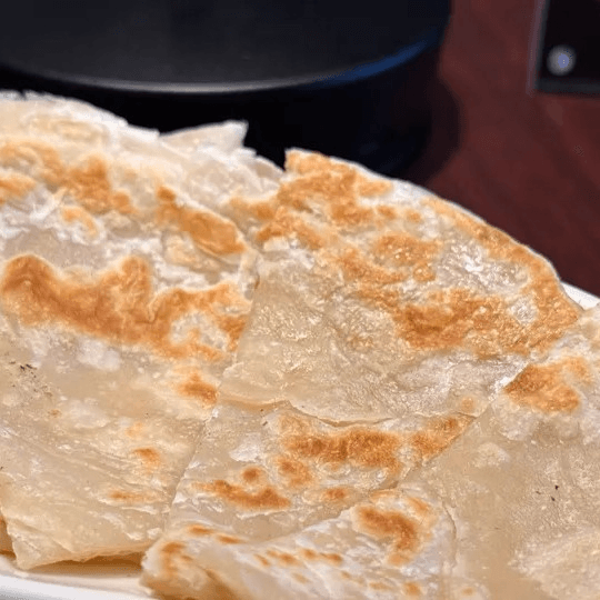 Selection of tri-tip steak marinated with light peanut curry, potatoes, very soft and delicate. Served with roti bread