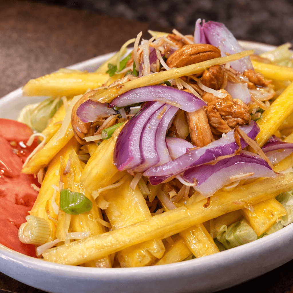 Seasonal green mango, roasted shredded coconut, cashew nuts, green onions, and shallots are mixed with our house dressing
